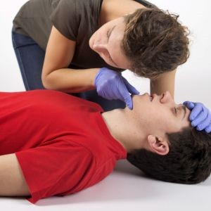 A légzésvizsgálat során a bajbajutott légútját először szabaddá kell tenni. A segélynyújtó egyik tenyerét a beteg