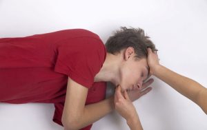 hajas fejbőrének határára teszi, másik kezével megfogja a bajbajutott állcsúcsát, majd fejét hátrahajtja.